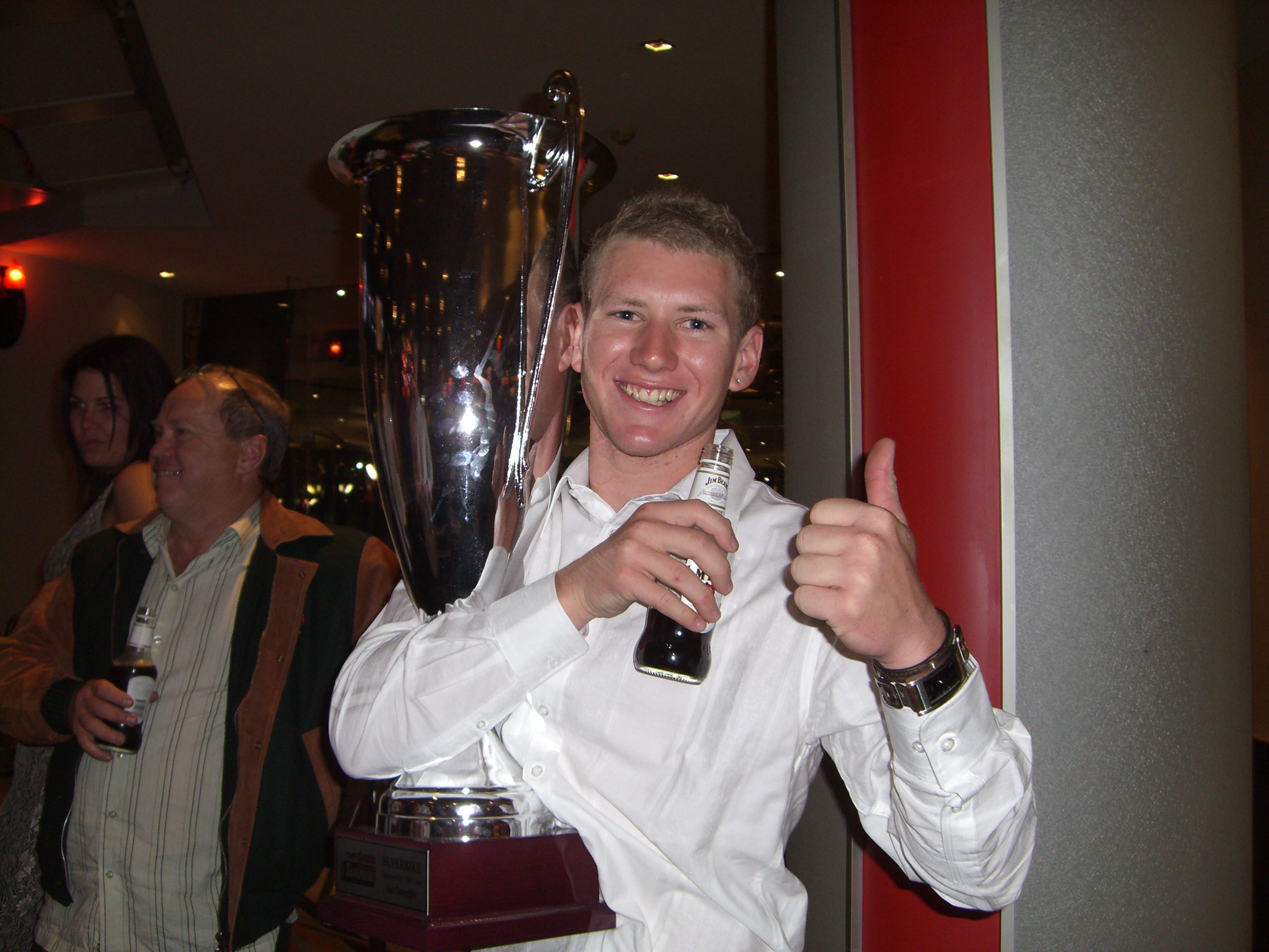 Anyway, I'm back home now and will try again next time. Here are a couple of photos I took on Sunday night of two former Kawasaki riders. Josh took Jamie's trophy and practiced his speech as Superbike Champion. What a great kid he is!