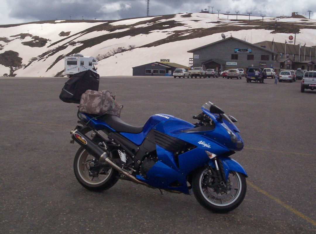 A ZX-14, fitted with a pair of Akrapovic carbon, a Ventura bag and centerstand. Other than that she is standard (so far), with 22,000km on the clock after 15 months of ownership. Want to add Power Commander and braided lines, and as was suggested a RAD guard wouldn't go astray either.