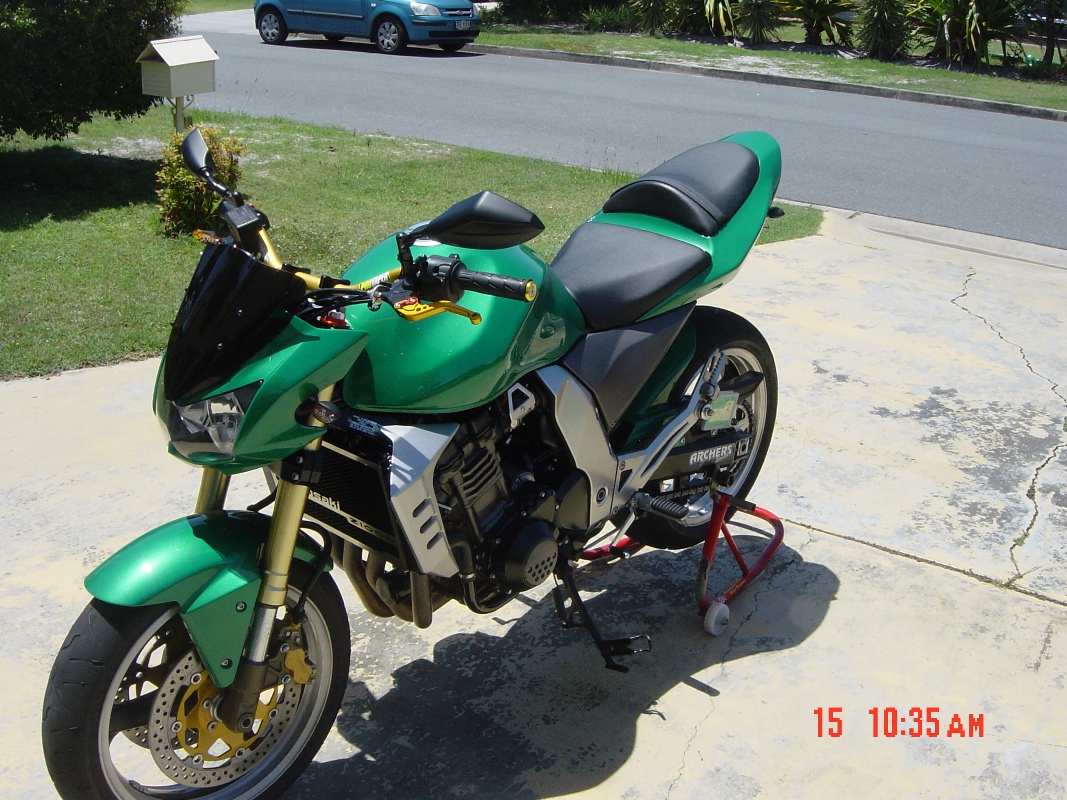 ive lerked around here for a while but never put my bike up so though this is a good opportunity, the name is Steady here is my 2005 Kawasaki Z1000, custom green, after market Pro-taper bars, aftermarket mirrors (a bit like the 09/10) custom radiator guard, shorty levers, muzzy pipe and a few other bling and performance bits. Would like to do a little more and add a belly pan. It’s a sweet but very different ride to my old bike a GSXR-750. Being a shade over 40 I sort of need the sit up a little more style these days if you know what I mean, hope you like it.
