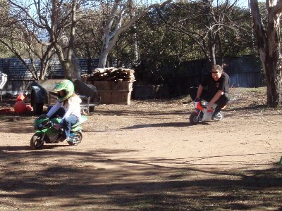 Today, he was belting around, dodging his slower sister on the Yamaha YZR30GP :shock: , and had knocked about 5 seconds off his best lap-time of the Backyard GP circuit. The look of concentration on his face has to be seen to be believed :shock: :lol: . I couldn't get past him on the faster Yammie, but at one point, trying to make a move up the inside on 'Swing Corner', he looked back, spotted the YZR fair up his date, and gave the kwakka the berries.......it promptly stepped out a couple of inches, kicked up a bit of roost, the foot went down, and away he went !! :lol: