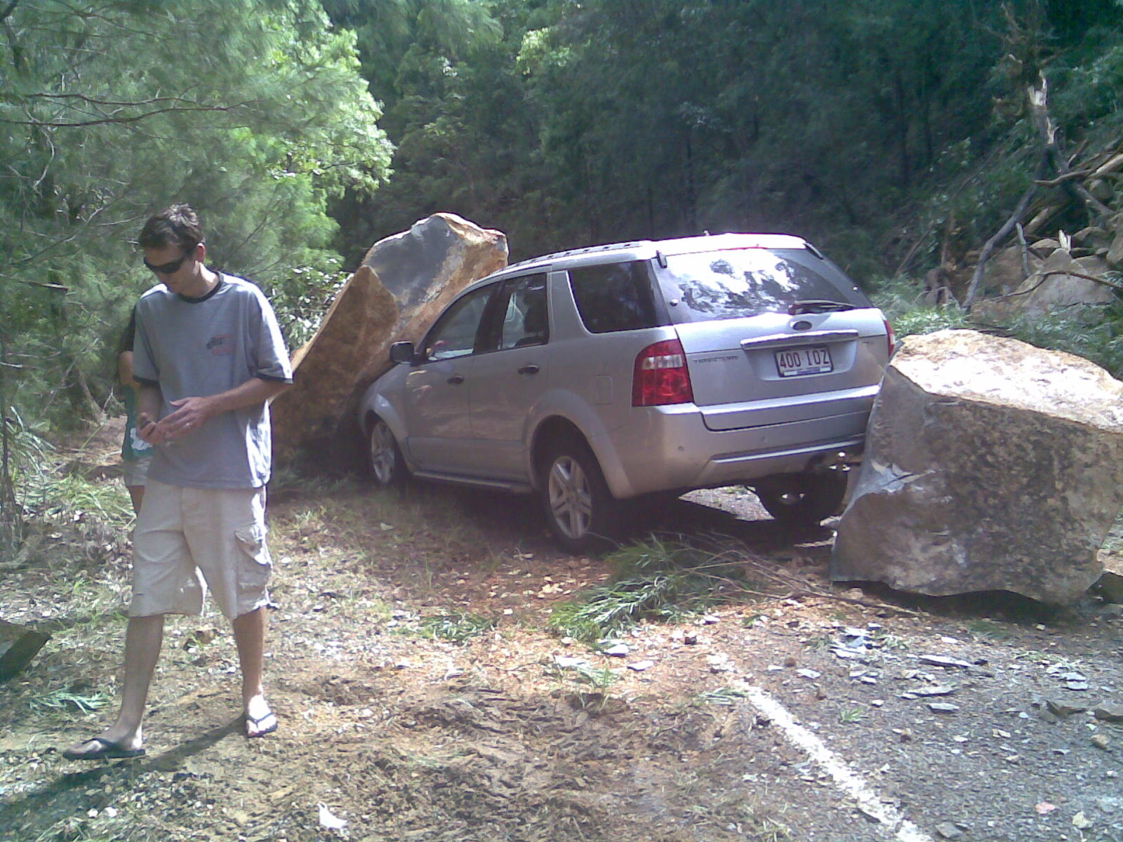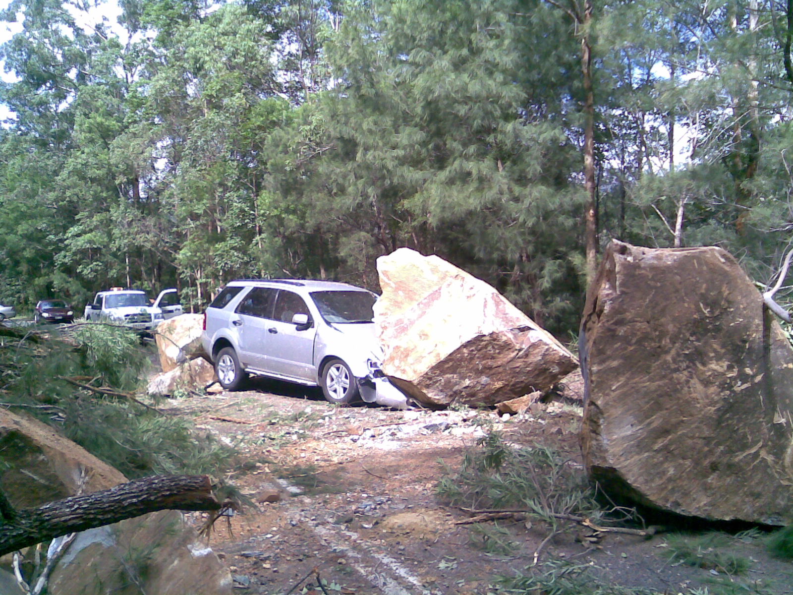 A huge landslide straight onto this car! We got there just after it happened. There is a huge cut-out in the mountain on one side (where all of the rocks came from) and a sheer drop off on the other side. Guy had kids in the car.