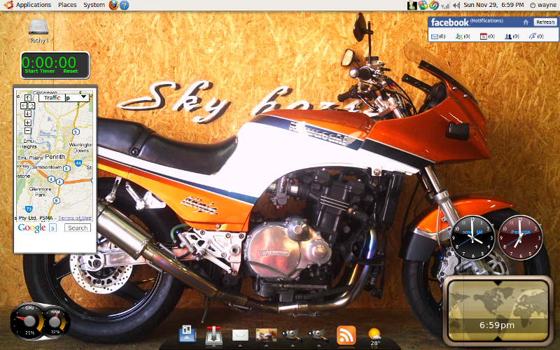 My desktop is empty cept for a clock and batt/temp indicator for the laptop - start most things with shortcuts and a few with menus.