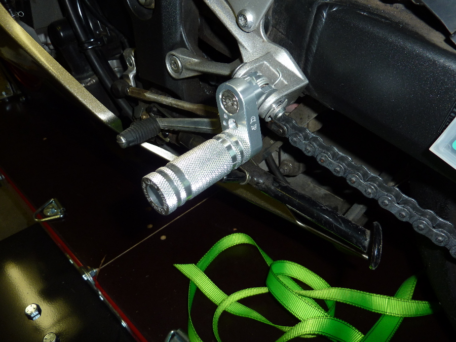 These pegs can rotate around the centre to give alot of adjustability back/up for the future. My right leg is maybe at 50% normal strength with a limited range of movement in my right knee, so I really need the extra room to be comfortable on the bike. As I get used to it and grind the pegs more and more, I will no doubt adjust them back and up. Being a gumby, I don't lean it over enough to get my knee down anyway :roll: .