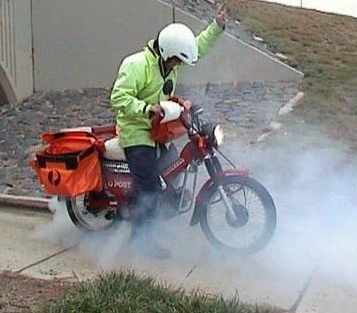 Our postie does wheelies, I am sure he loads extra mail in the back saddlebags to aid lofting the front wheel..... thats pure skill