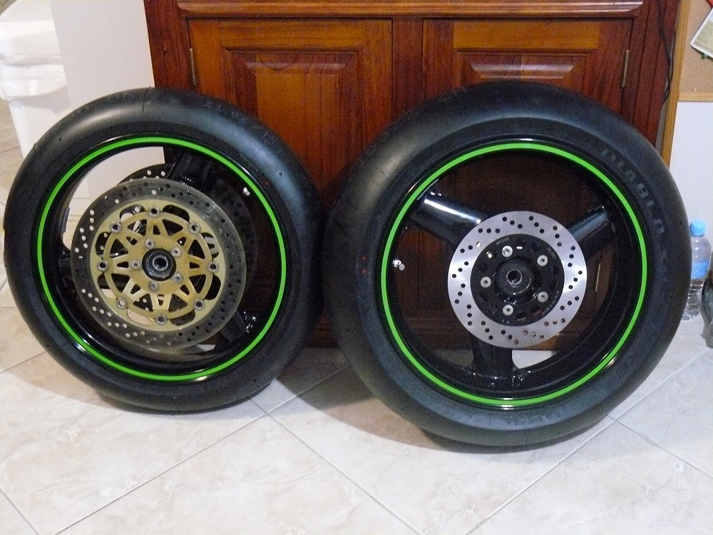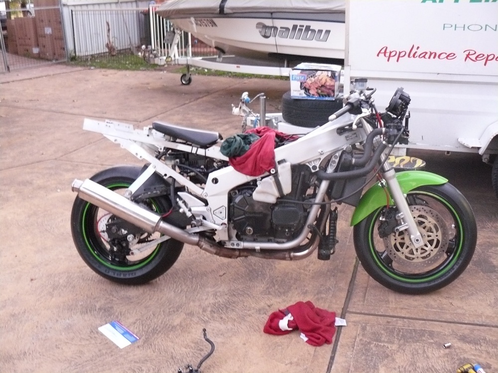 the build has been going steady, unfortunatly no pics yet cause it does look much diffrent as yet. The bike is sitting on my new kaneg stands awesome value for money and work great, the wheel is at laurie aldertons getting the dent removed, the front and rear suspension is at frank ponz getting rebuilt and set up for my weight, the fairings (which i got off wet 4 u great fairing nice and light well made) and tank is going to the panel beater on monday morning to get painted a nice shiney kawasaki green with white number boards. i got the valves checked all in spec bar 2, ordered a new timing chain and tensioner cause it was a little suspect better to be safe than sorry, the brake calipers are off and sandblasted the red off them not sure weather to leave them sliver or paint them?? Have got hh pads and hel brake lines (thanks to suberbike supply those guys are aweomse
