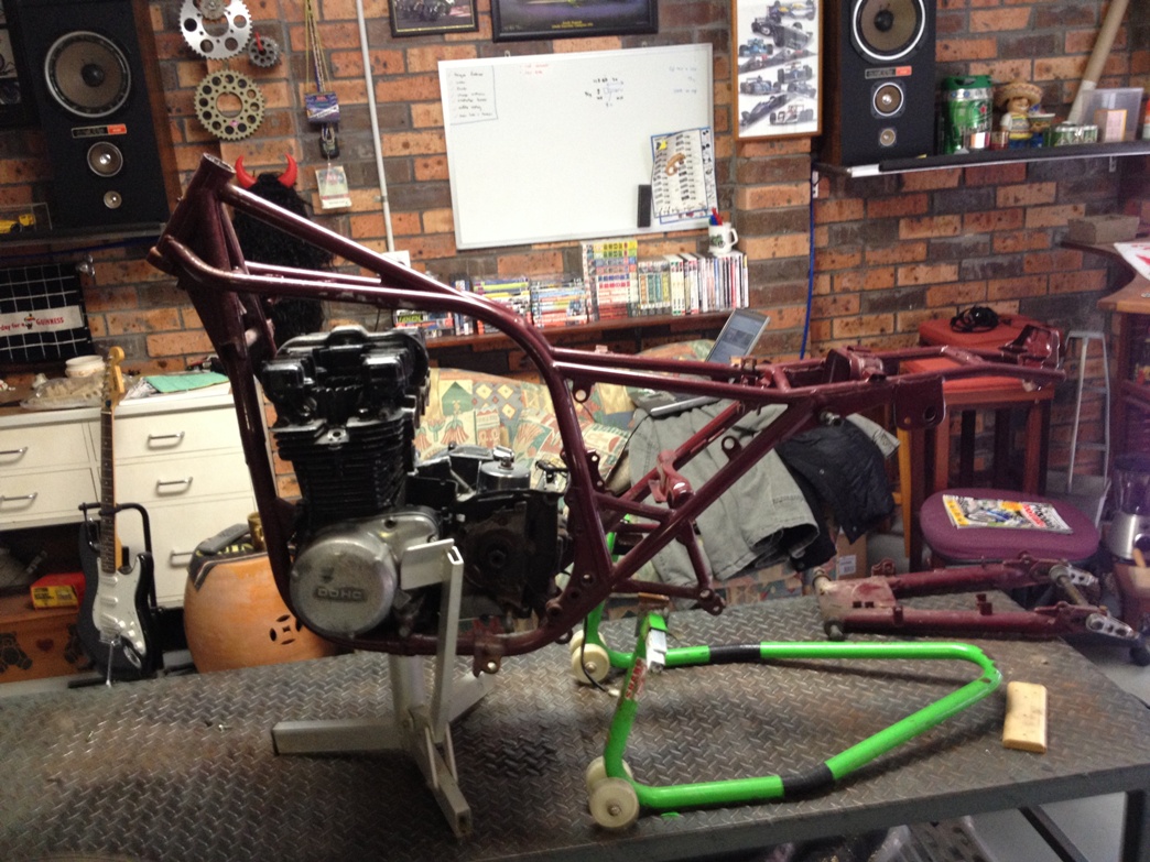 On the chassis front, first step will be to enlarge the swingarm pivot holes by reaming out the frame, and getting the upper shock mounts relocated (purely for that laydown look). Then save the $ to source a set of ZRX triple clamps, and we’re well underway.