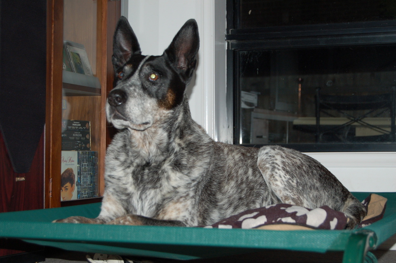 Buddy's a cross Bull Terrier - Blue Heeler - sweetest nature unless we're not home or he doesn't like you. unfortunately he wasn't socialised wiht other animals and has a tendency to try and kill anything furry (ate the budgie...). I don't know his history so I don't let children play with him but he's found himself a great retirement home.