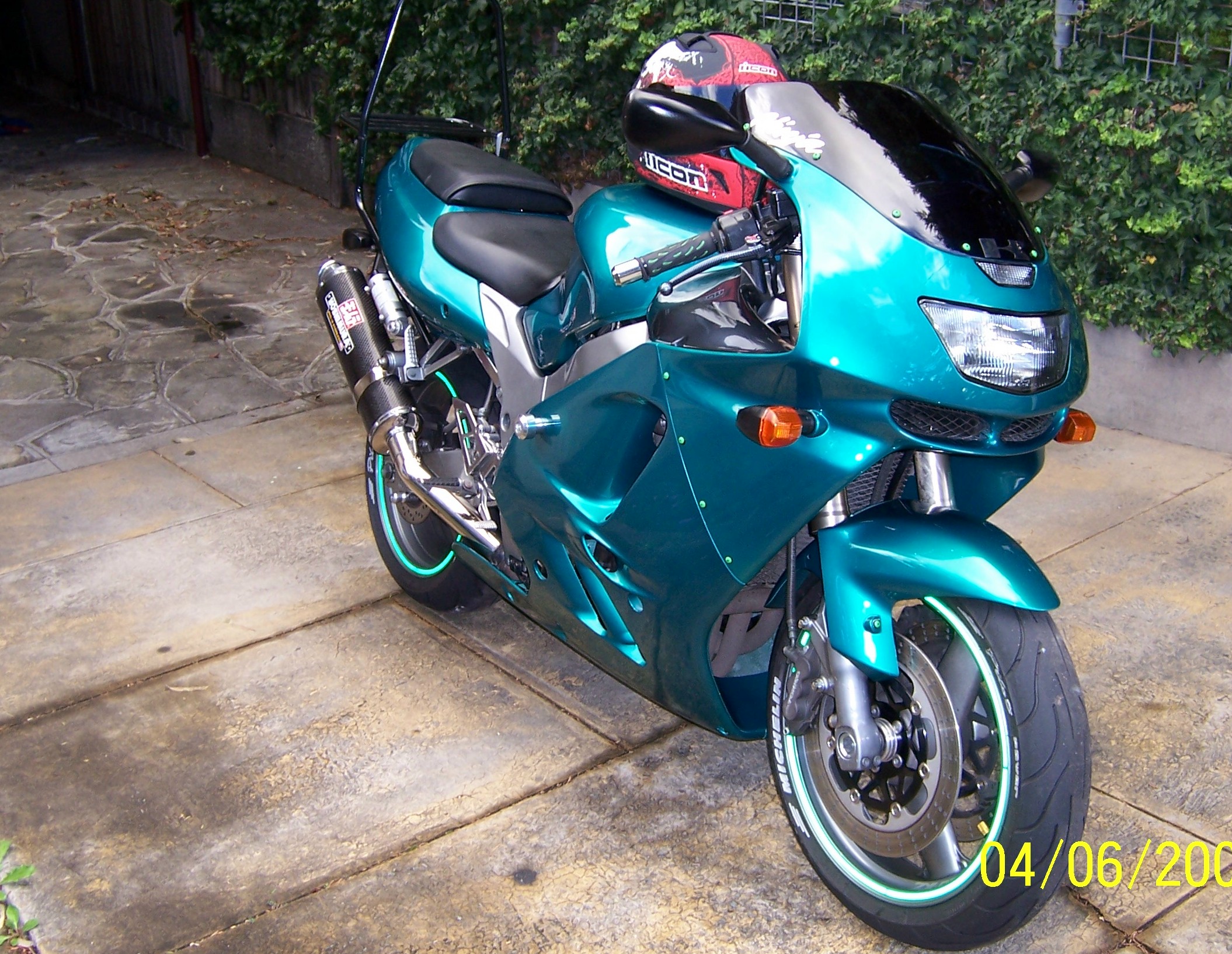 2012 ZX14R in Golden Blaze Green,Two Brothers polished aluminium slip ons,green tinted lens all round,custom airbrushed seat cowl..screen...and rear hugger,US green inner fairing panels,fender elim,custom Zx14 heel plates,green wheel stripes