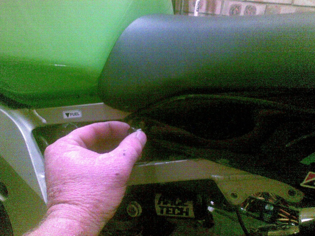 Mine is a bit different to Paul's. Ignore the lifting blocks I fitted to it to raise the seat but you can see the front and back brackets that hold the seat down. I get it on and off with a Phillips head screwdriver poked through the top cover at the back of the seat. I will have to get more pics tomorrow to show you what I mean.