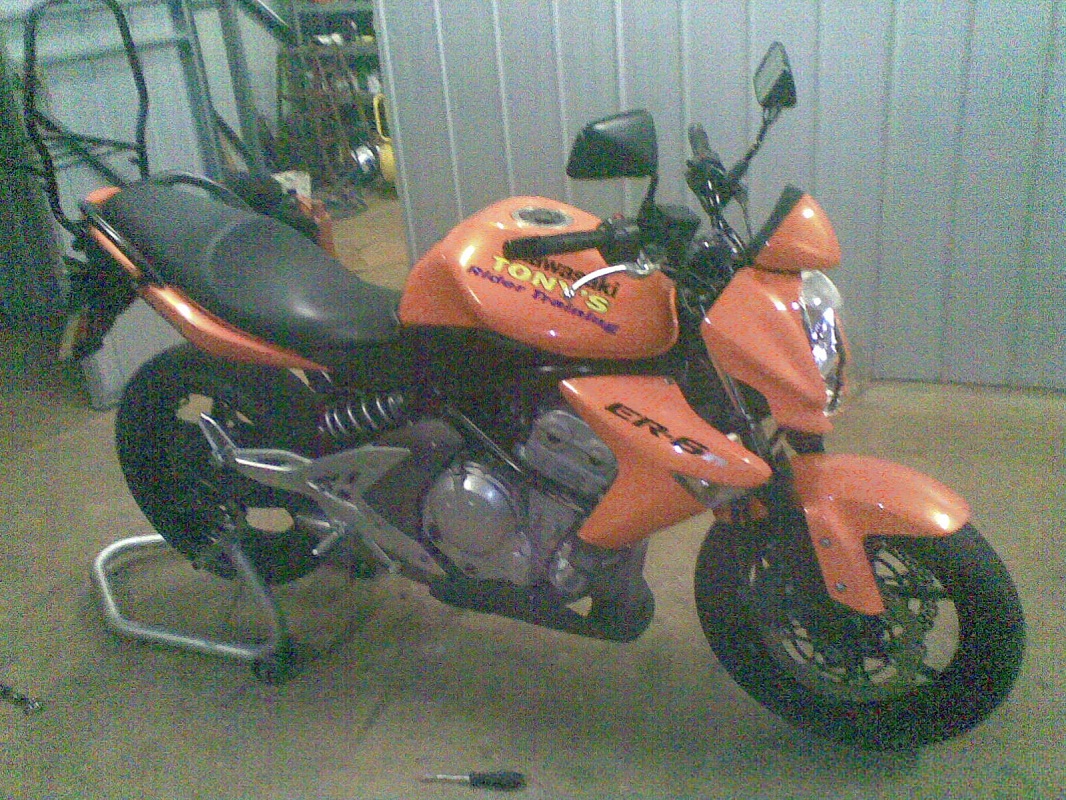 Bought another Er6n today for my school, 3rd one.(all three are orange) I am convinced that the ER6s improve with age- rides every bit as good as the other two but it has 39000km compared to 18000 and 10000km. I have ridden a few Er6s and the more kms the better- the engine feels better and especially the suspension. Steered weird when I bought it, but straightened bent bars, adjusted bars and chain as well as pump up the tyres and it is AOK. Dunno how the chick rode it as it was - it was horrible. :shock: