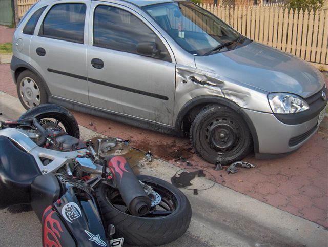mine is pure idiot... lapse of concentration in peak hour traffic, riding home from a mate's place, buzzed by a lane splitting ducati, shock, look, brakes, swerve, bang... grazed the bumper of a car, scratched one panel with my knee as I dropped the bike, $950 damage to the car, feckin' insurance repairs. bike scrubbed up ok with a spit and polish and a new alternator cover. not nearly as cool as your offs, but cost me a packet, so pay attention kids