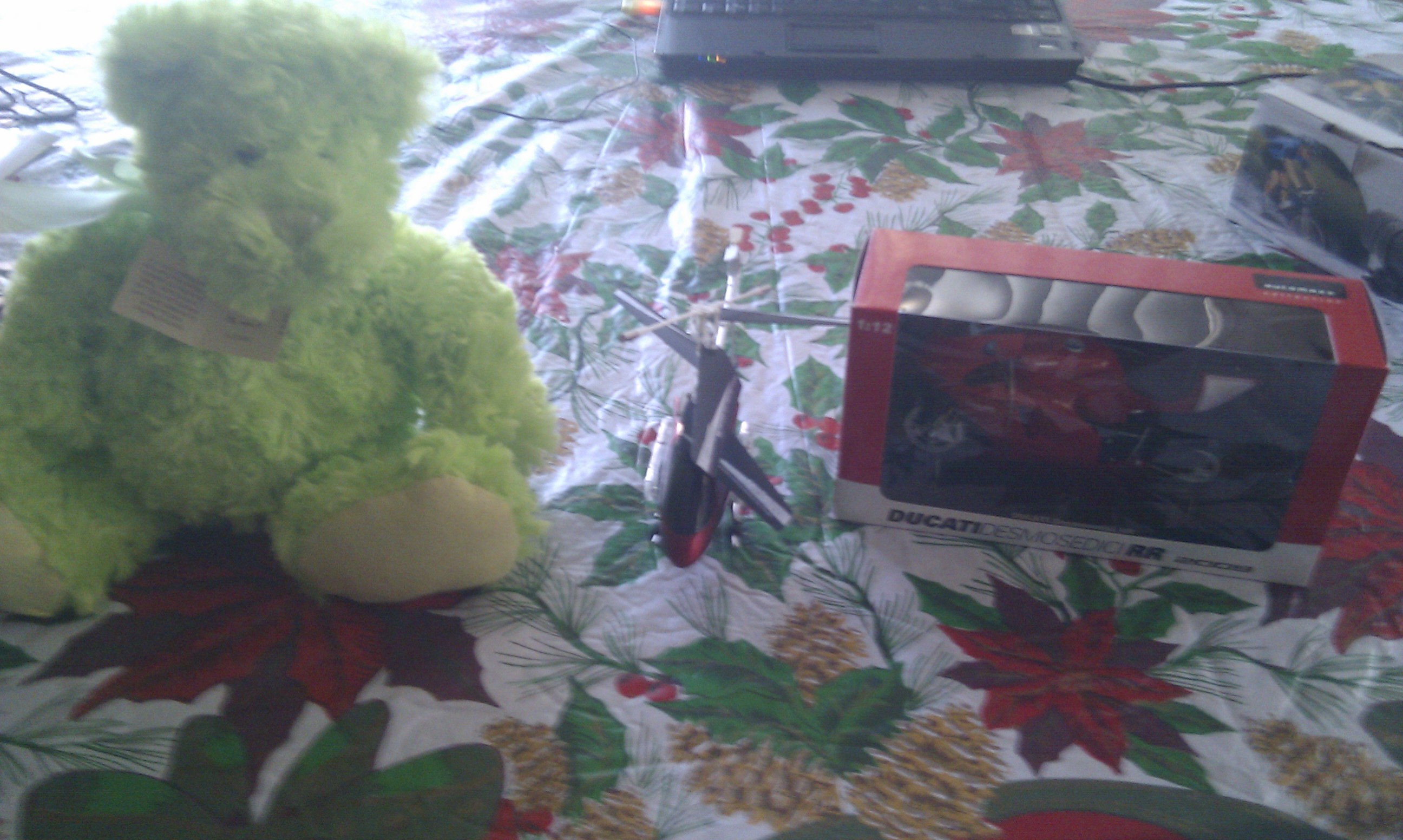 (you clearly know!) little remote control copter (very cool!) and a scale model of a Ducati Desmo (while it is a cool bike this person clearly knows my dislike of the red beasts)