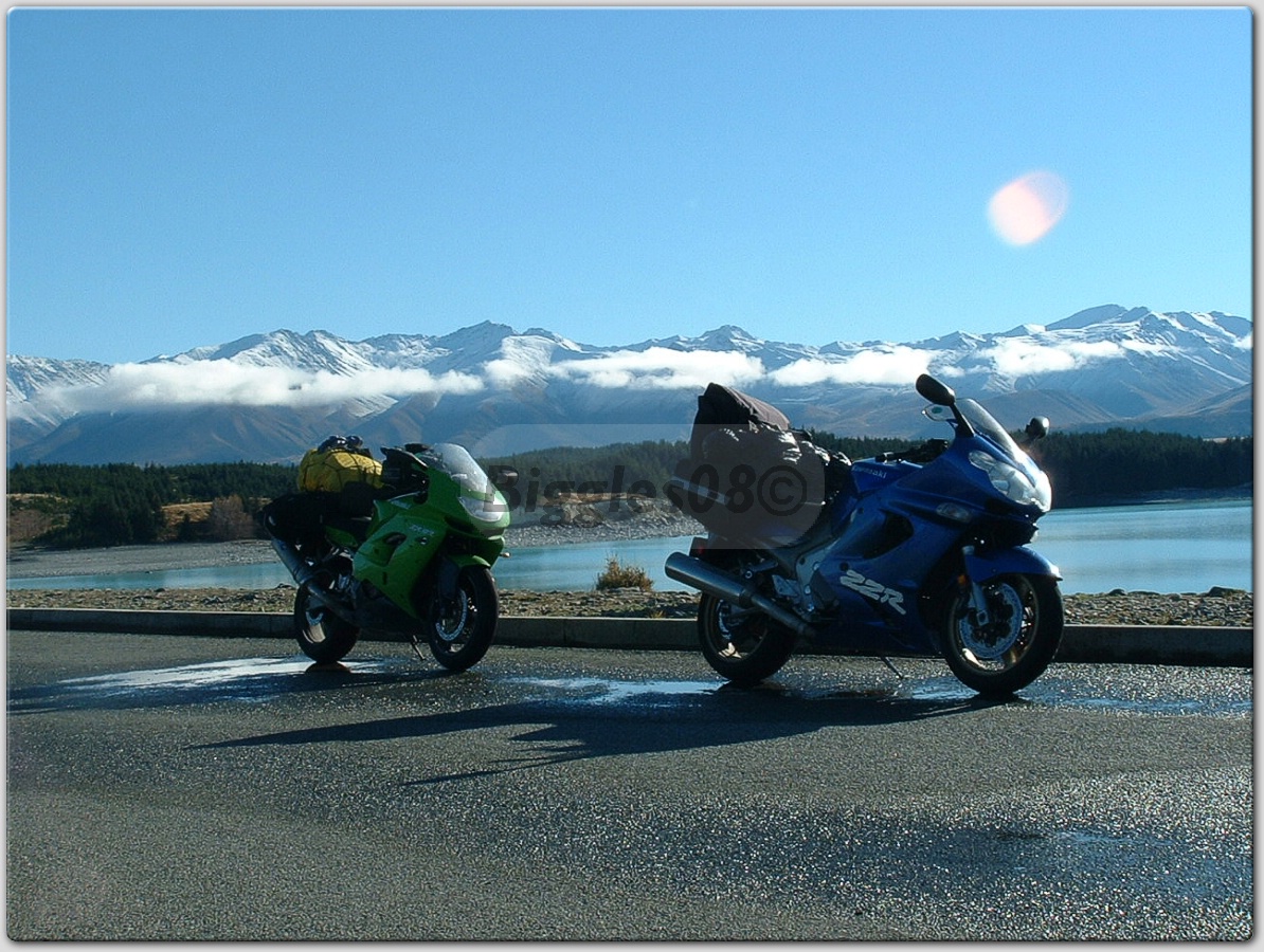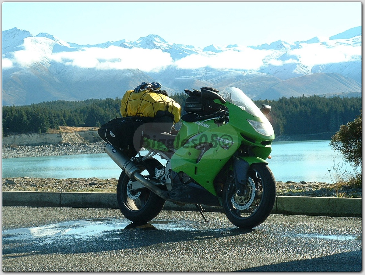 Now my bike...I've owned my 1998 C1 ZX9R for around 5 months now and spent quite some time on her (the bike folks....focus...move on now!!!) I have recently ridden to what's called "the brass monkey" held in central Otago in the SI of New Zealand...I live in Auckland. It performed awesome and I clocked up in excess of 3600km in that trip...good fun! I love feeling that punch in the mid range revs that turns into a knockout blow the higher the revs get...its got amazing power! I loaded her up with sports panniers and a tail bag and set out. I was traveling with my old man who was riding his ZZR1200 (Kwaka runs in our family's veins apparently ;-)) and we spent most of our time at 100kph...honestly...we were never cruising down the roads near lake Tekapo at between 220kph and 255kph honestly....officer...honest angel11.gif